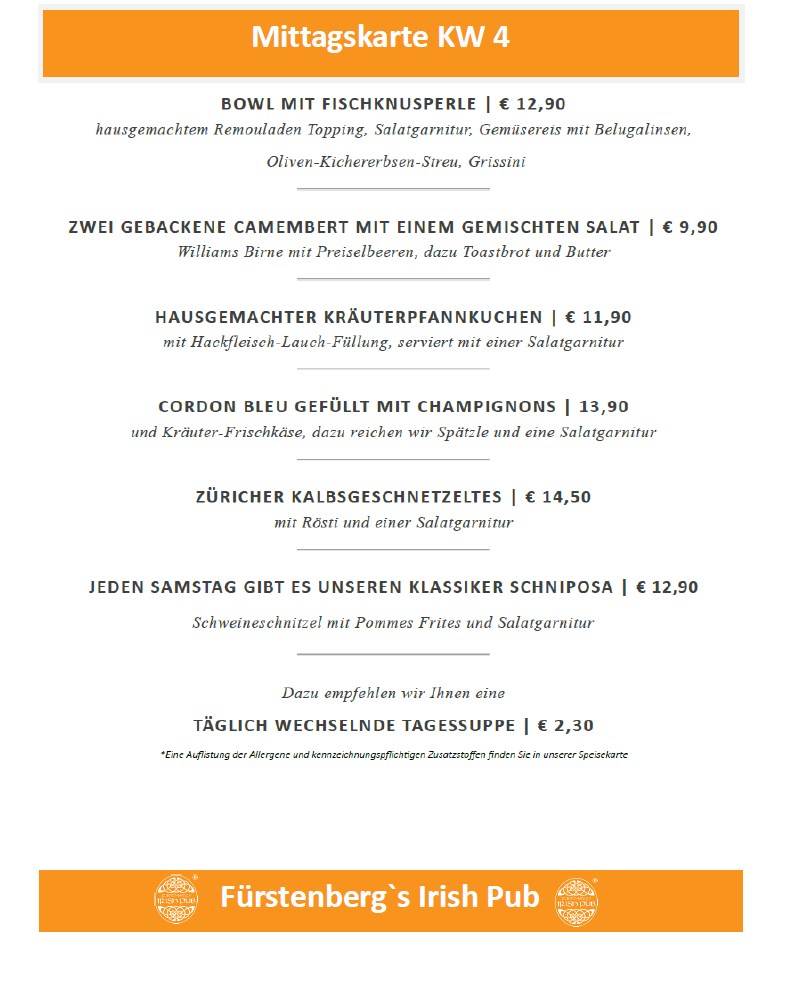 Mittagstisch Aktuell bieten wir den Mittagstisch nur in Villingen und Tuttlingen an. Infos zum Mittagstisch per E-Mail! E-Mail Welche Pubs interessieren dich? Welche Pubs interessieren dich?AlleVillingenTuttlingen Diese E-Mail Adresse abmelden Ich habe die Datenschutzhinweise zur Kenntnis genommen Senden Mittagskarte KW 4