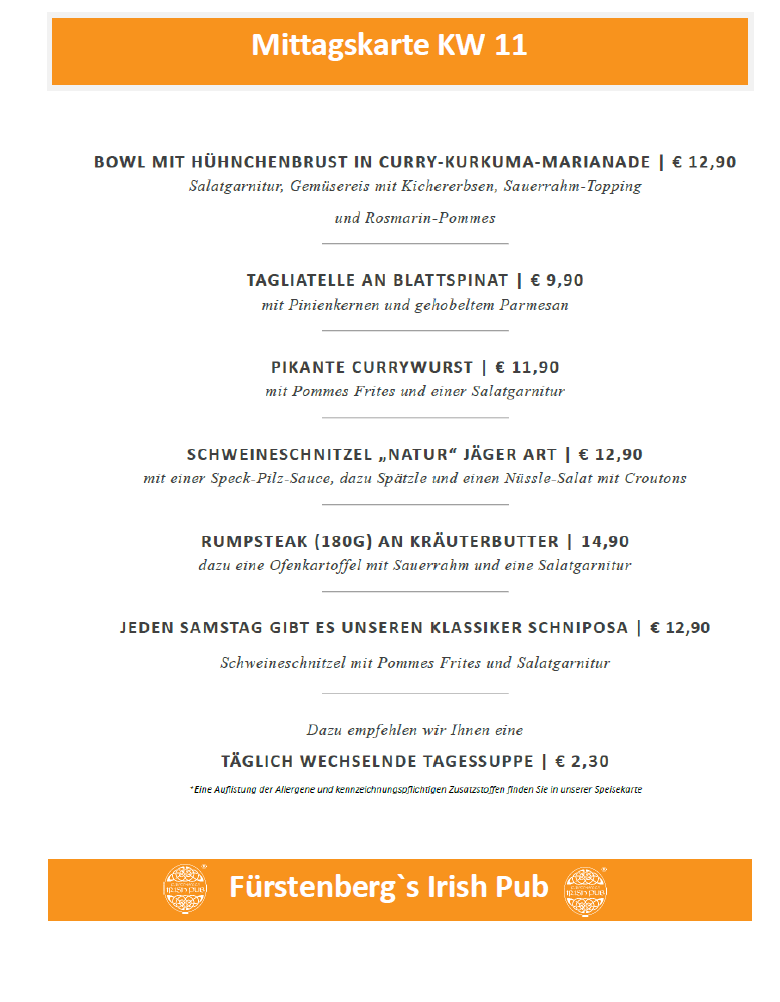 Mittagstisch Aktuell bieten wir den Mittagstisch nur in Villingen und Tuttlingen an. Infos zum Mittagstisch per E-Mail! E-Mail Welche Pubs interessieren dich? Welche Pubs interessieren dich?AlleVillingenTuttlingen Diese E-Mail Adresse abmelden Ich habe die Datenschutzhinweise zur Kenntnis genommen Senden Mittagskarte KW 11