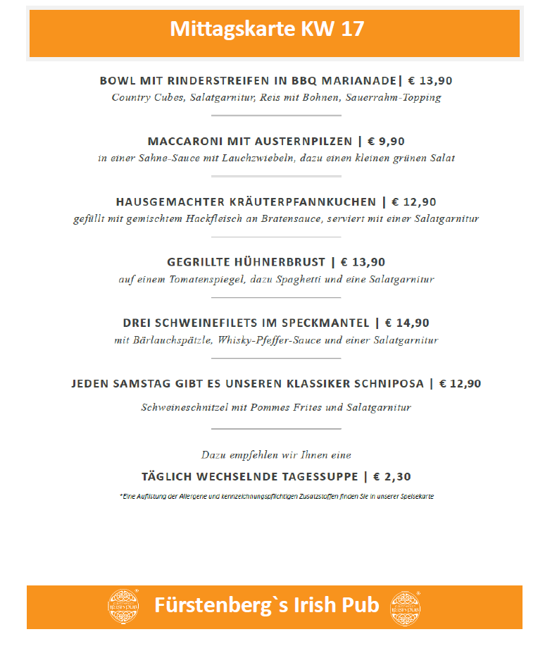Mittagstisch Aktuell bieten wir den Mittagstisch nur in Villingen und Tuttlingen an. Infos zum Mittagstisch per E-Mail! E-Mail Welche Pubs interessieren dich? Welche Pubs interessieren dich?AlleVillingenTuttlingen Diese E-Mail Adresse abmelden Ich habe die Datenschutzhinweise zur Kenntnis genommen Senden Mittagskarte KW 17